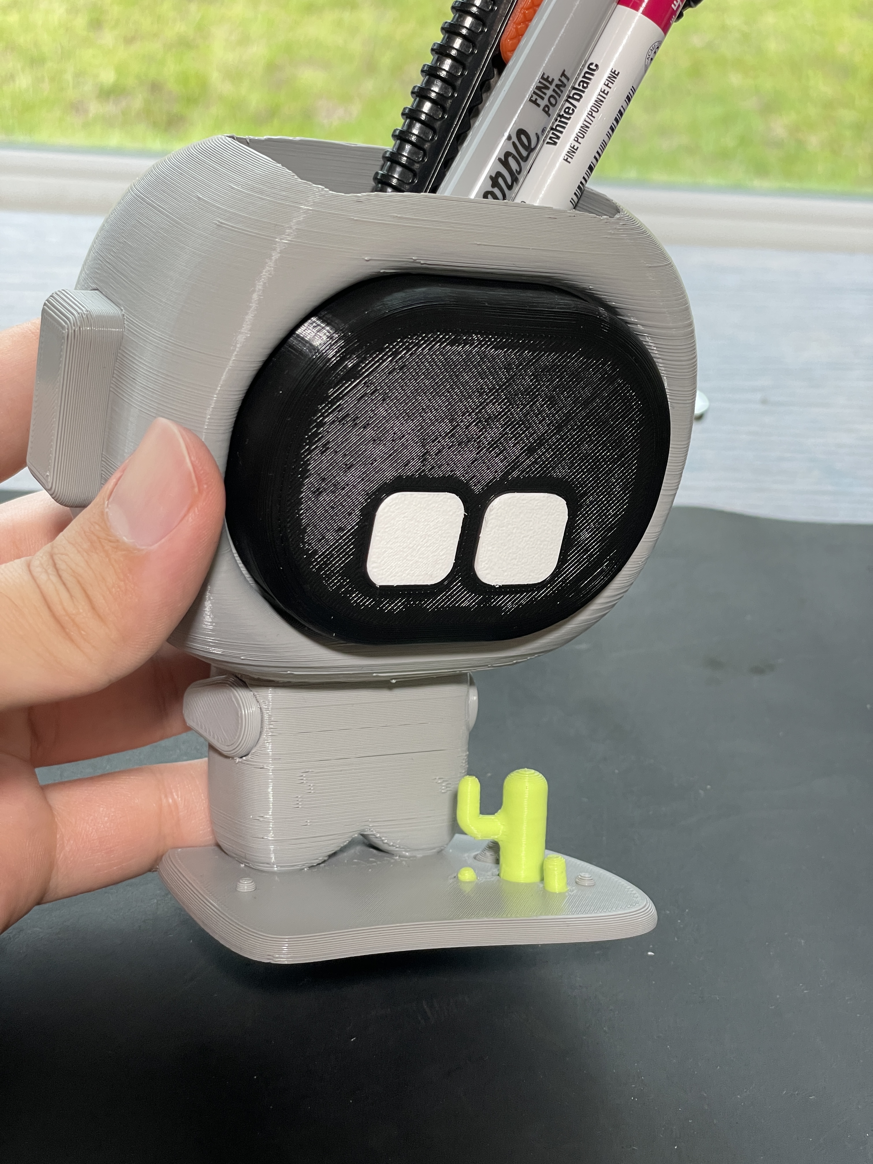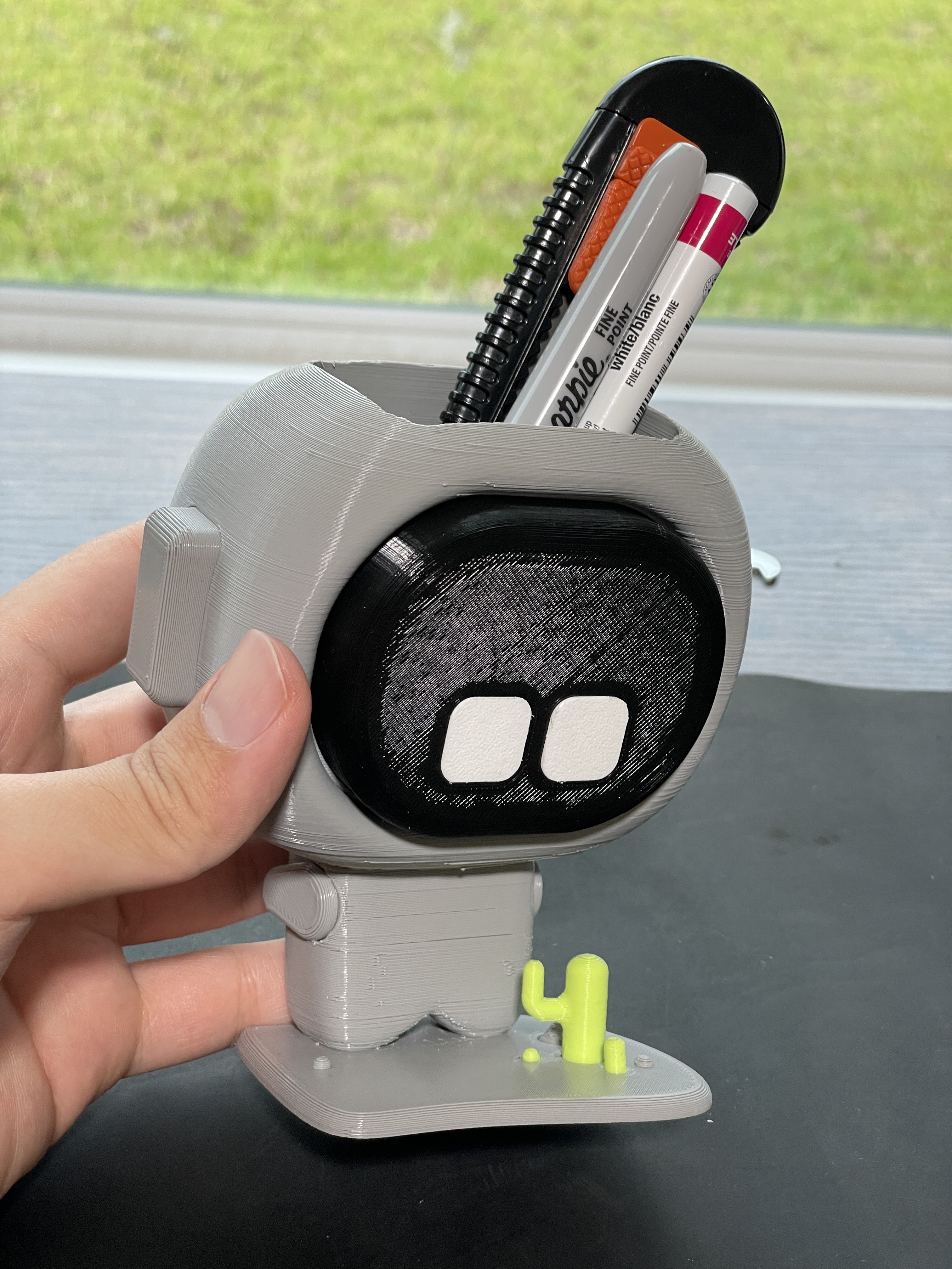 This cute robot with cactuses in front of it is small pen holder for your desk 🙂